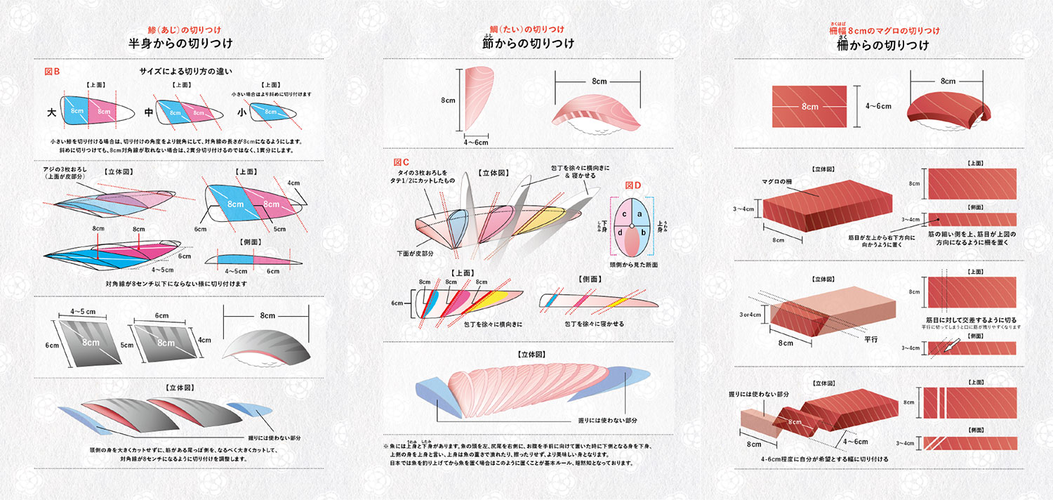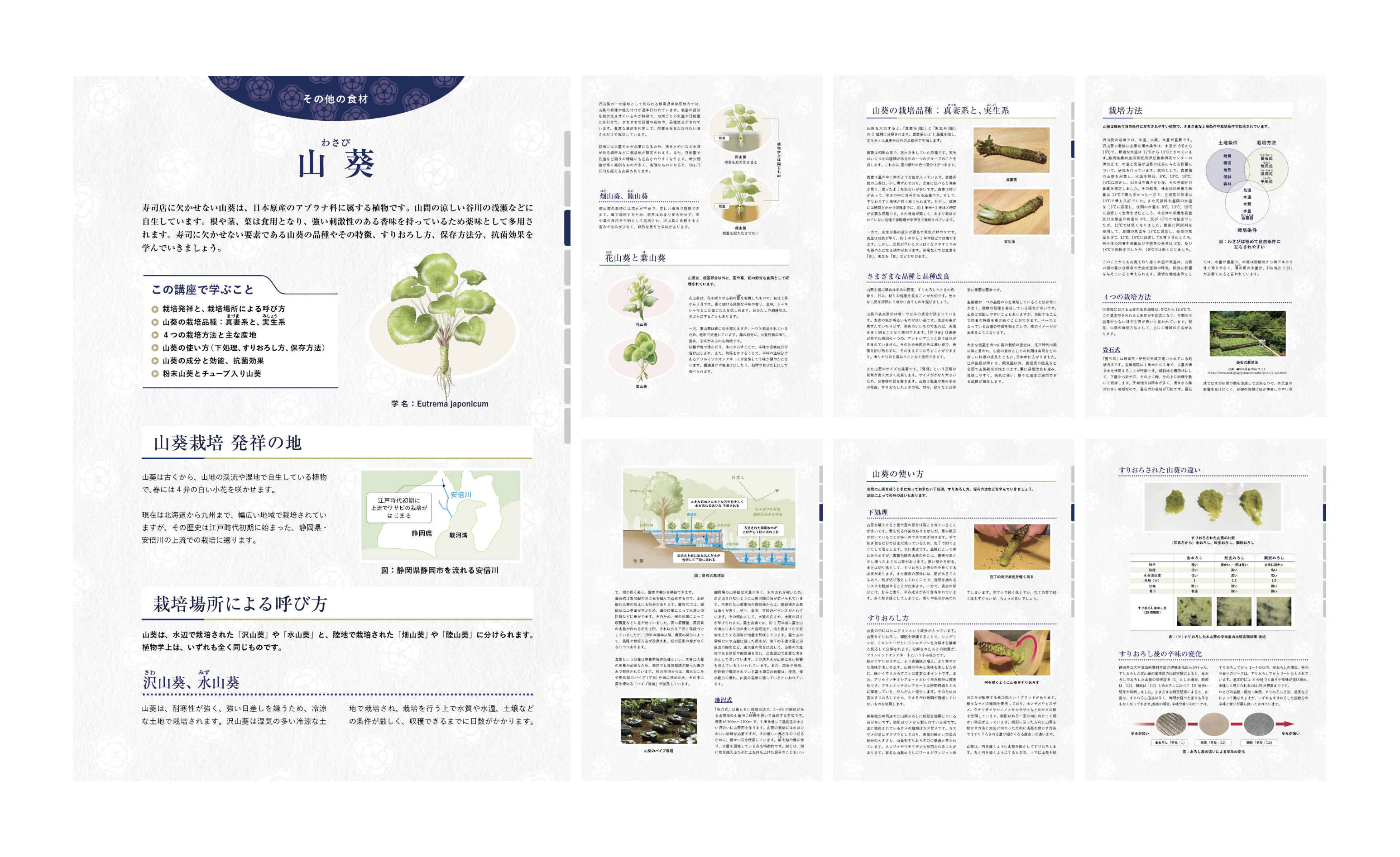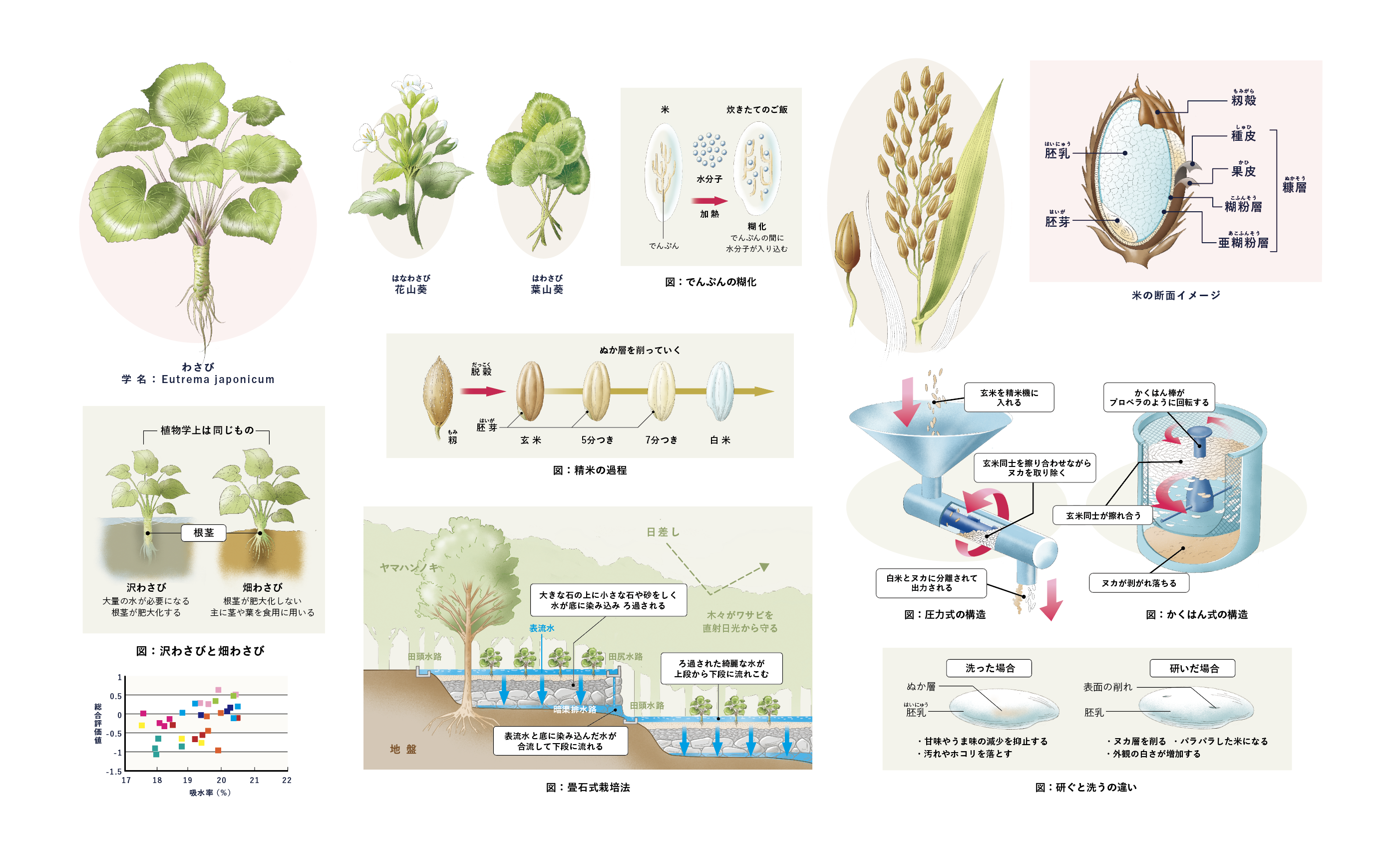 教材内図版(わさびの種類、栽培方法、お米の構造、精米方法など)